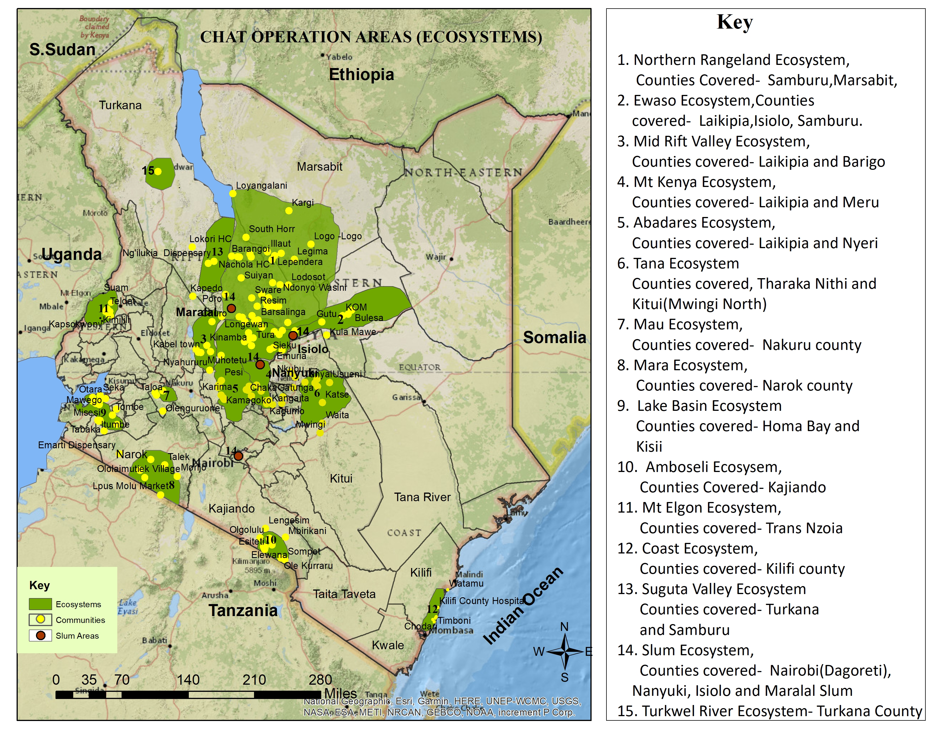 Suburban slums around Karen in Nairobi County; Nanyuki Slums in Laikipia; Isiolo Town slum in Isiolo county and Maralal Town slums in Samburu.